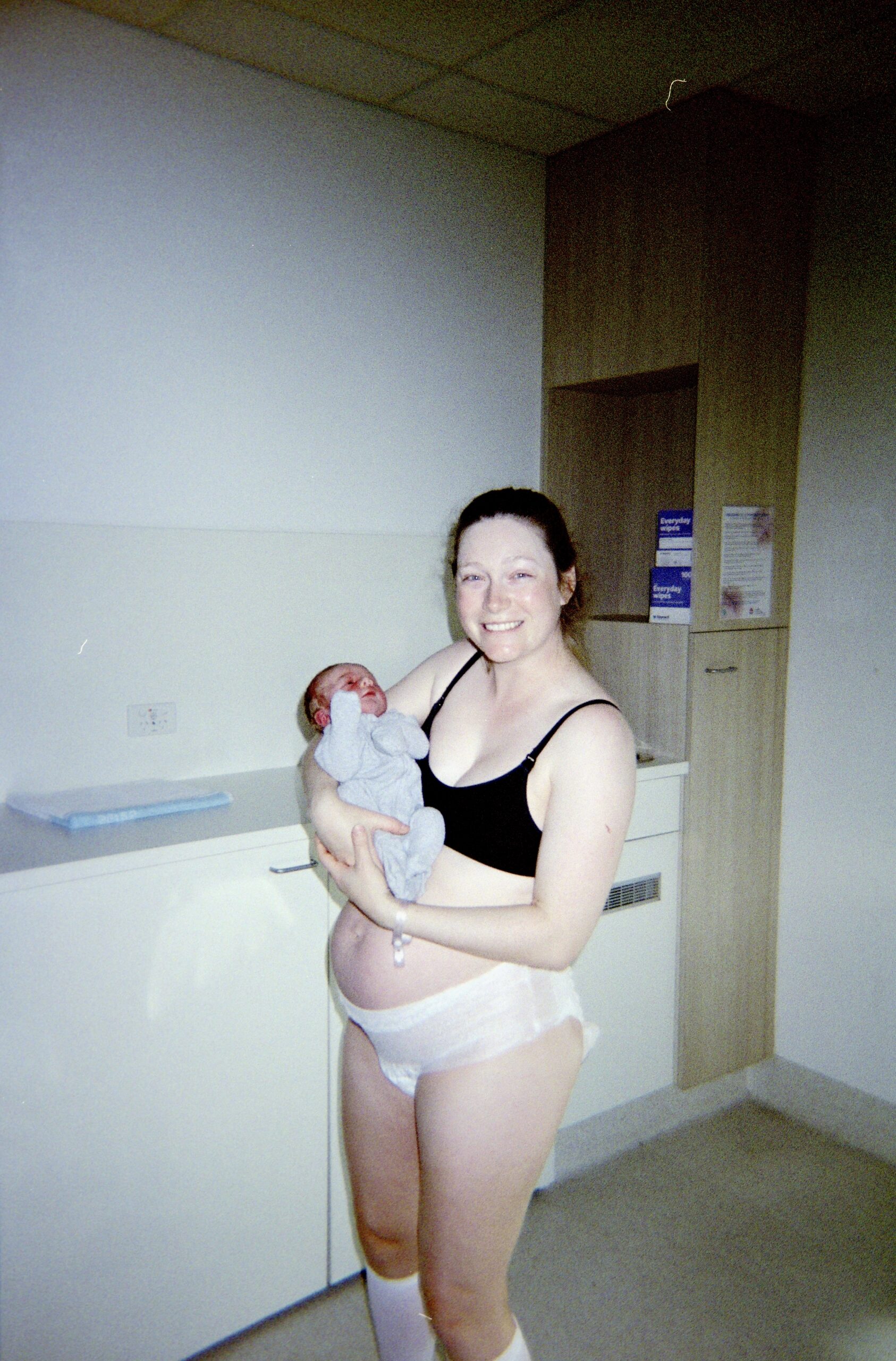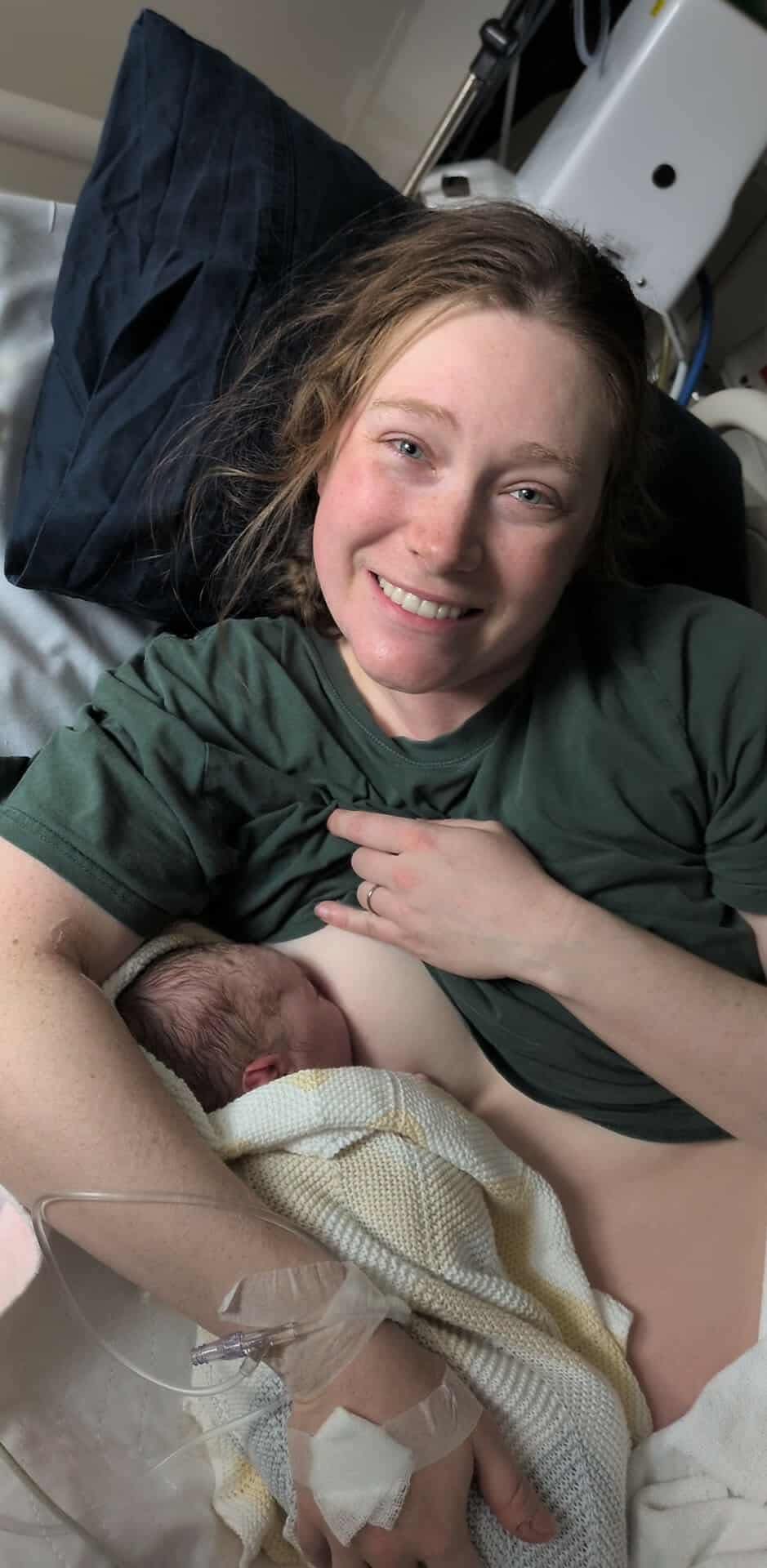 However, complications quickly became apparent. Josey experienced a 1.5-litre postpartum haemorrhage due to multiple factors: “My uterus was floppy… some of the membranes were a bit ragged… I’d also had what we discovered quite quickly was a third-degree tear.” The tear was caused by Murphy’s compound posterior arm presentation: “he was born with a compound posterior arm so his arm was up over his shoulder like this and it was that little elbow in my bumhole.”